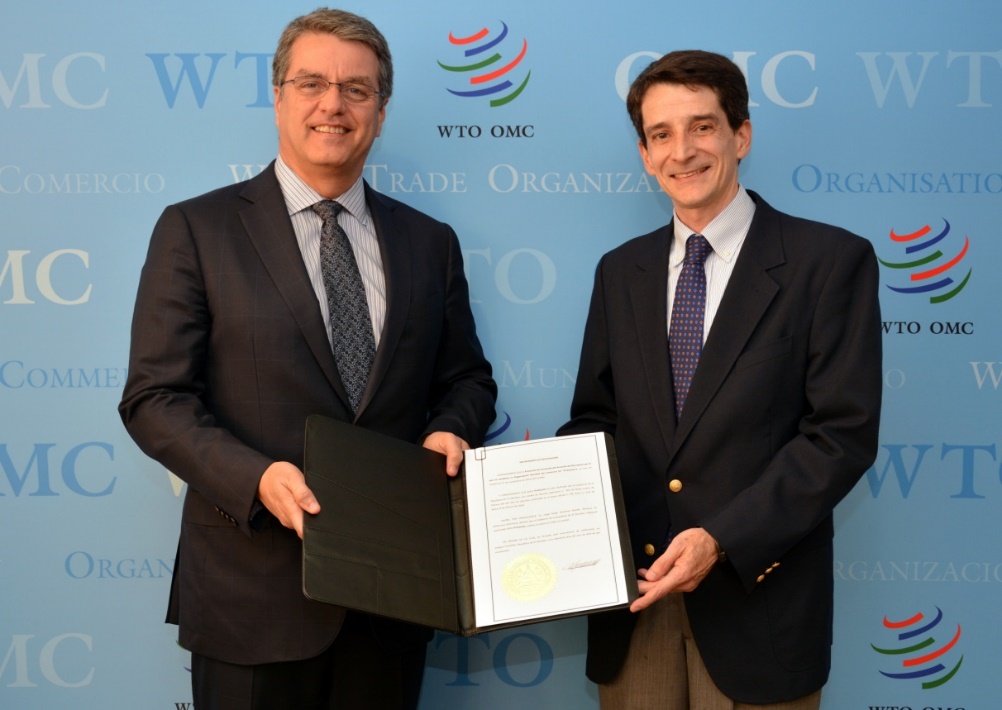 Dicho depósito lo realizó el Embajador Representante Permanente Francisco Lima, en nombre del gobierno de El Salvador, el día 4 de julio del presente año, convirtiéndonos en el tercer país de la región centroamericana y el quinto de Latinoamérica que acepta el Protocolo de Enmienda adoptado por el Consejo General de la OMC, el 27 de noviembre 2014.
