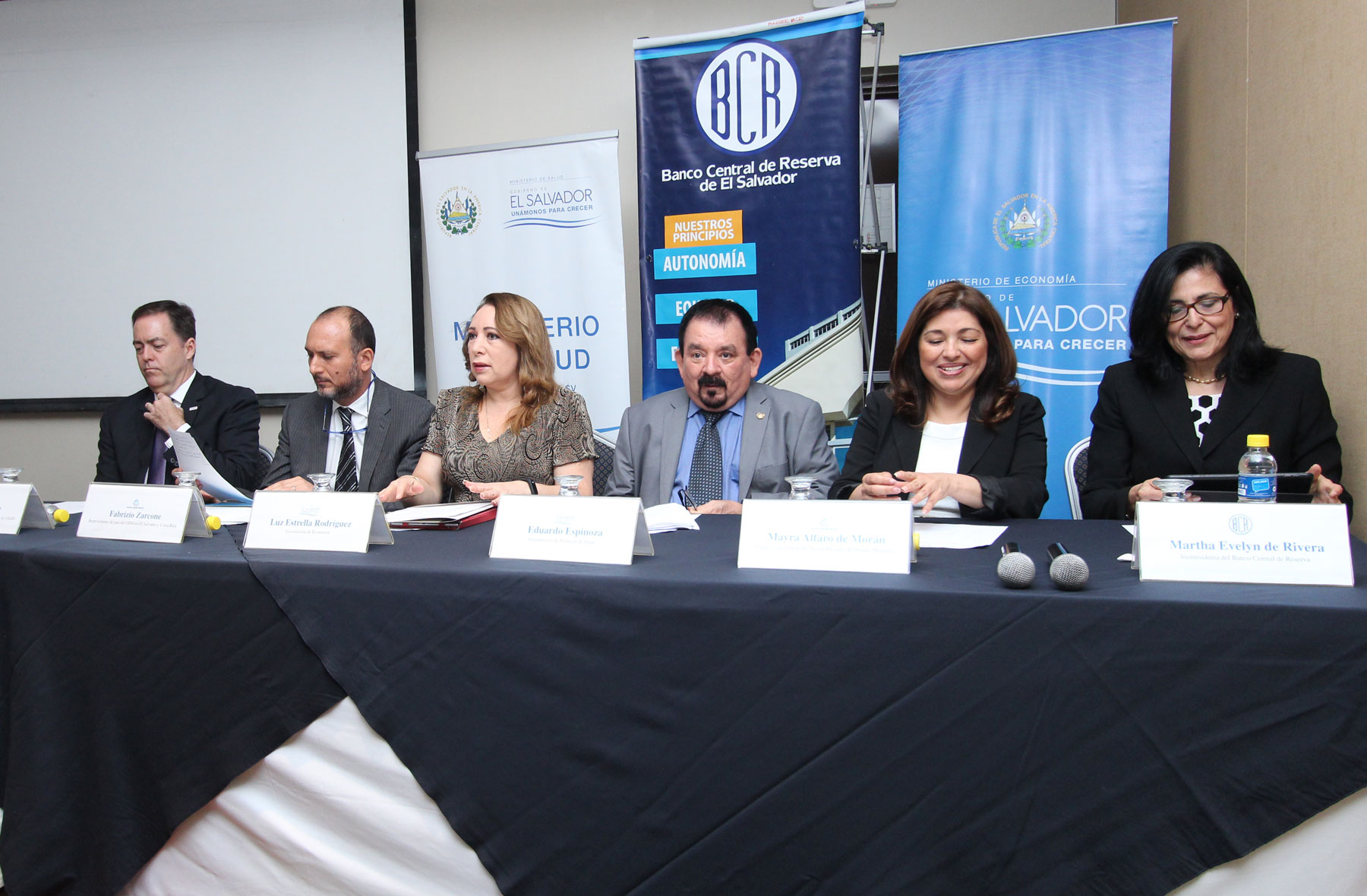 El evento estuvo presidido por la viceministra de Economía, Luz Estrella Rodríguez; el viceministro de Salud Pública, Eduardo Espinoza; la vicepresidenta del BCR, Marta Evelyn de Rivera; el representante de país de Grupo del Banco Mundial (GBM) en El Salvador, Fabrizio Zarcone; la Especialista Senior del GBM, Mayra Alfaro de Morán y el director de la Oficina de Crecimiento Económico de USAID El Salvador, Gregory Howell.