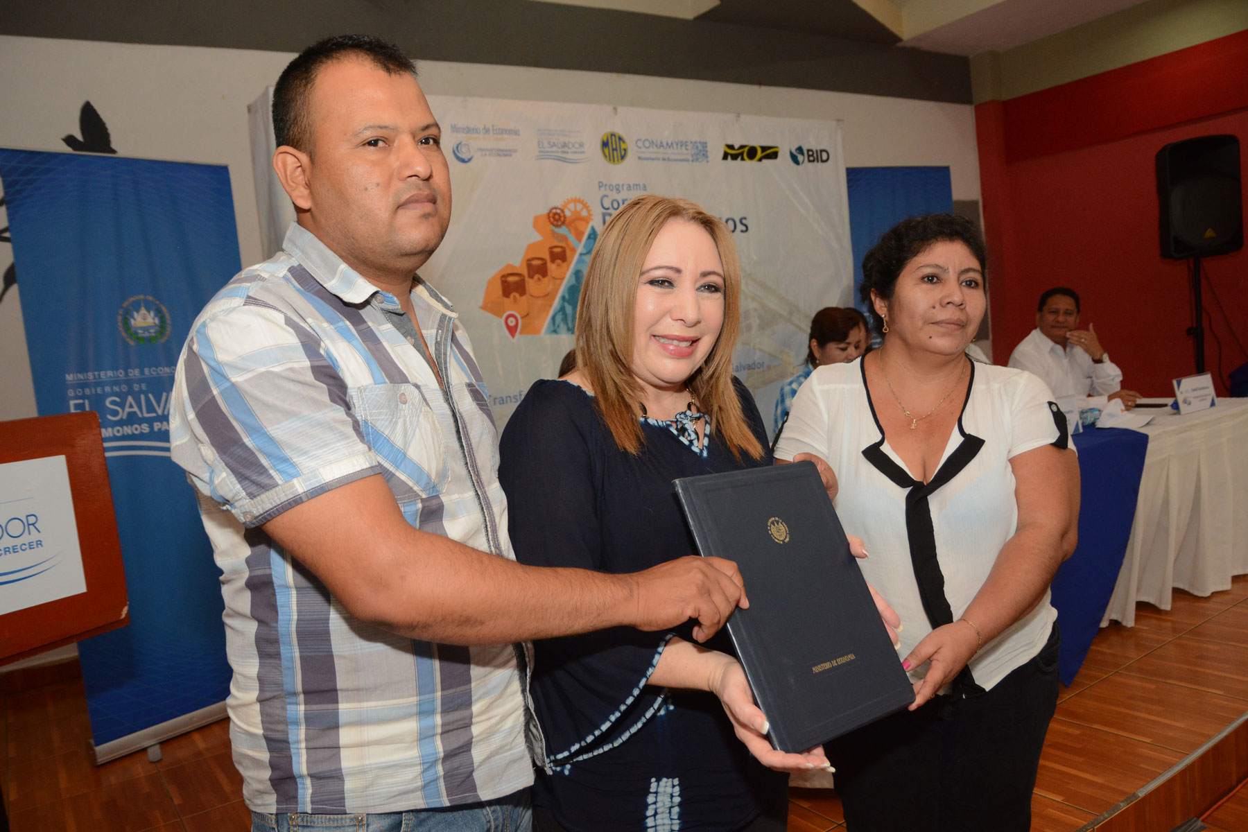 En el marco del lanzamiento de la segunda convocatoria del concurso de Fondos no reembolsables ‘Corredores Productivos 2018’ realizado este 26 de abril en Jiquilisco, Usulután, La ministra de Economía, Luz Estrella Rodríguez, entregó al cooperativista Moisés Hernández, la documentación que sustenta la solicitud de Denominación de Origen del Camarón de la Bahía de Jiquilisco para su registro.