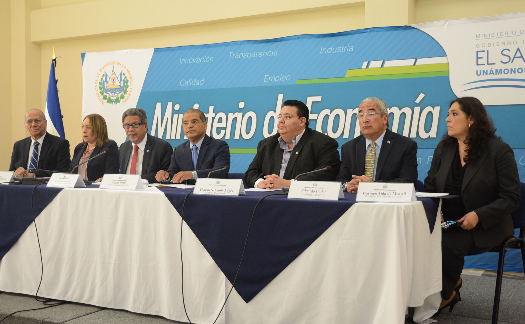 Autoridades de gobierno, encabezadas por el Vicepresidente de la República, Oscar Ortiz; el Ministro y Viceministra de Economía, Tharsis Salomón López y Luz Estrella Rodriguez, respectivamente, y el viceministro de Relaciones Exteriores, Integración y Promoción Económica, se reunieron con altos dirigentes del sector privado que forman parte de la Comisión Intergremial para la Facilitación del Comercio (CIFACIL), con el propósito de dar a conocer los pormenores de la incorporación de El Salvador al proceso de Unión Aduanera impulsado por Guatemala y Honduras.