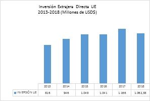 En relación a la Inversión Extranjera Directa (IED) de la Unión Europea en El Salvador ascendió a US$ 1,062.38 millones, lo que representó el 6.07% de la IED total de nuestro país. Destacando la inversión en los sectores de: telecomunicaciones, pesca e industria en general.